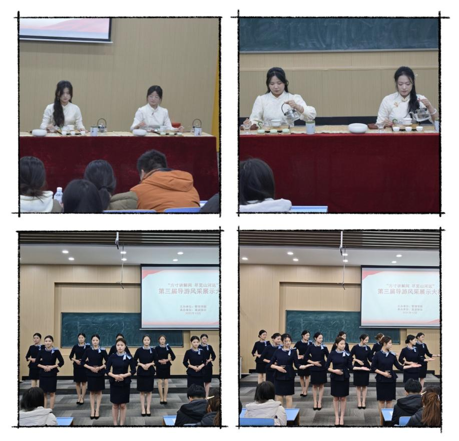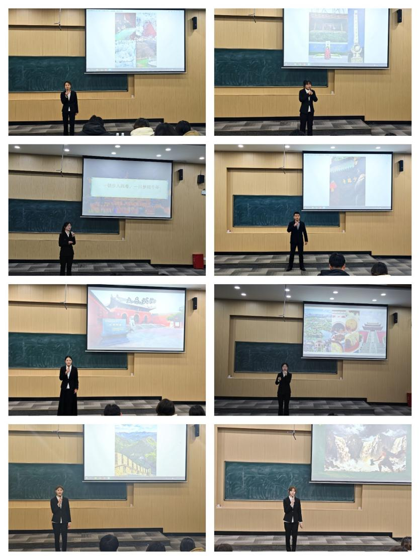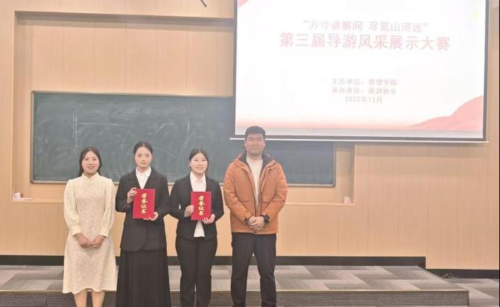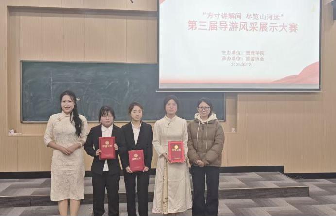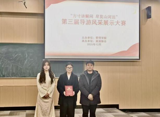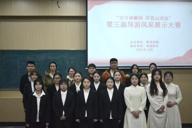 为丰富校园文化生活,彰显专业育人特色,提升旅游专业学生导游服务技能与职业素养,2025年12月17日18:30管理学院在文华3-阶梯4教室成功举办“方寸讲解间 尽览山河远”暨第三届导游风采展示大赛。本次大赛由管理学院主办、旅游协会承办,全体辅导员参加,共同见证选手们的精彩表现。