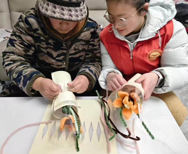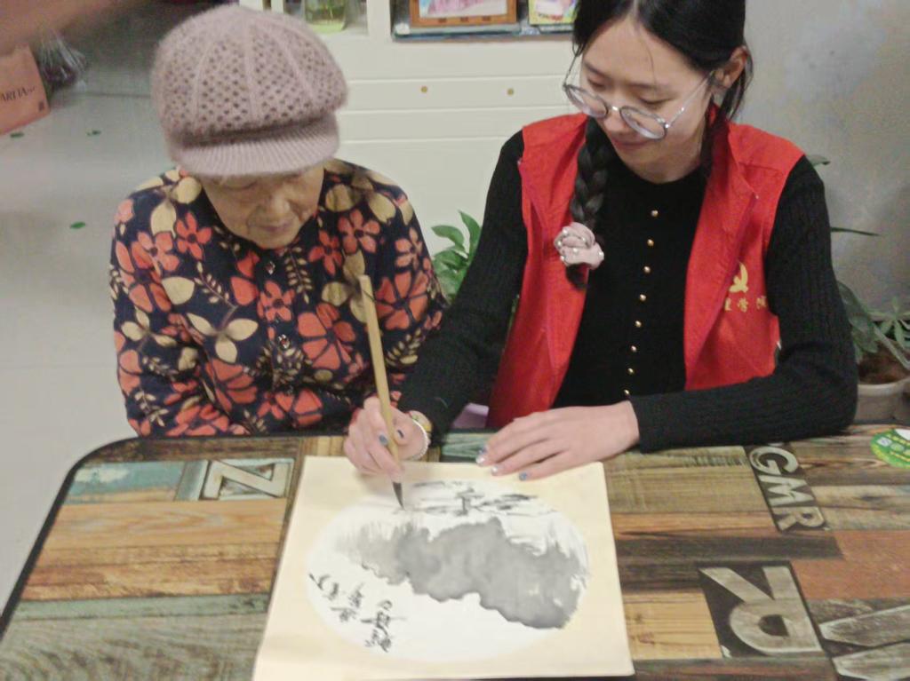 清晨,志愿者们准时抵达各服务点,在完成环境布置与物品调试后,丰富多彩的活动陆续展开。在书画互动体验环节,志愿者与老人们一同执笔挥毫、点染丹青,于笔墨流转间传递温情;随后开展的象棋交流活动中,志愿者们耐心讲解规则、陪伴对弈,老人们或从容布局,或笑语落子,方寸棋桌旁气氛轻松而融洽。手工制作环节里,在志愿者的细心协助下,长辈们亲手完成一束束精美的花艺作品。一双双历经岁月的手,创造出充满生命力的作品,他们的脸上洋溢着由衷的成就感与喜悦。“看到爷爷奶奶们这么开心,觉得所有的准备都是值的。”志愿团队的学生感慨道。