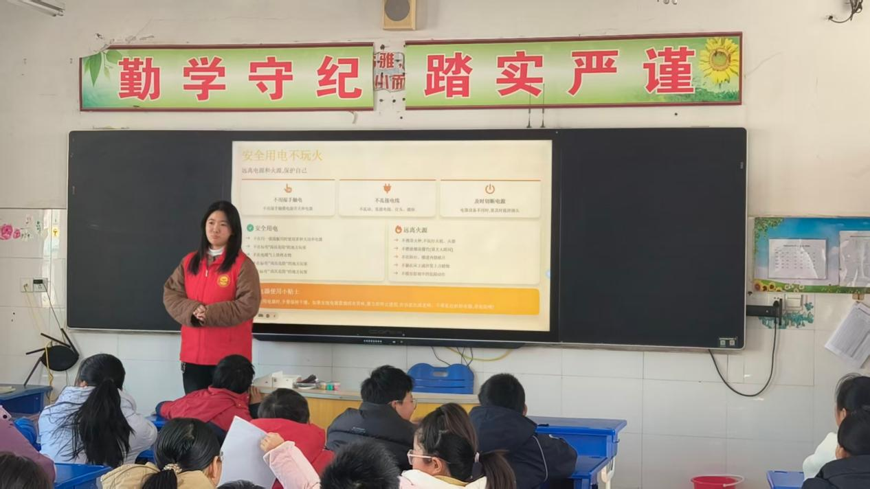 课堂上,志愿者窦文灿通过主题PPT,运用生动形象的图文与场景化讲解方式,紧扣小学生认知特点,围绕安全用电、防火防坠落、预防煤气中毒等寒假高频安全风险展开细致宣讲。她结合“不用湿手触碰电器”“不乱拉乱接电线”“不攀爬阳台栏杆”等日常行为规范,借助真实案例向同学们普及安全知识,让大家深刻认识到:安全是生活的永恒底线,隐患潜藏在家庭与社区的各个角落。一次不经意的疏忽,都可能引发严重后果,给个人、家庭乃至社会带来难以弥补的伤害。