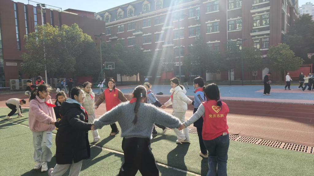 课堂上,志愿服务团成员们结合小学生的身体特点和运动兴趣,精心设计了踢足球、丢手绢等趣味运动项目,让孩子们在轻松的氛围中体验运动的乐趣。足球场上,孩子们分组组队、相互配合,传球、射门间尽显活力,欢声笑语洒满赛场;丢手绢游戏时,大家围坐成圈、尽情奔跑,在追逐与互动中拉近彼此距离,现场气氛热烈又温馨。整个体育课堂中,成员们全程引导陪伴,既叮嘱孩子们做好运动防护、注意安全,又鼓励胆小的孩子大胆参与,让每个孩子都能融入其中、享受运动的快乐。