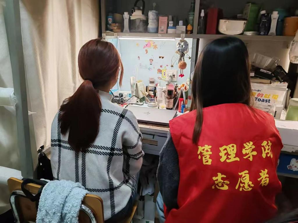 活动中,身着“管理学院志愿者”“管理学院党员志愿者”红色马甲的工作站党员及办公室成员走进新生宿舍,与新生面对面交流。在宿舍里,大家详细询问新生的适应情况,了解她们在学业规划、生活起居、人际交往等方面的困惑与需求。面对新生提出的专业学习、校园生活设施使用等问题,志愿者们耐心解答,结合自身经验给出建议,同时鼓励新生尽快适应大学生活,积极参与校园活动,合理规划学业与生活。
