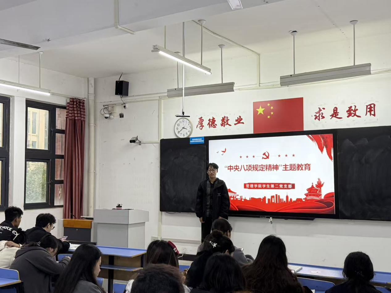为深入学习贯彻中央八项规定精神,引导青年党员强化纪律意识、锤炼过硬作风,管理学院学生第二党支部于2025年10月14日在文化楼1-212开展“中央八项规定精神”主题教育,全体学生党员参加。