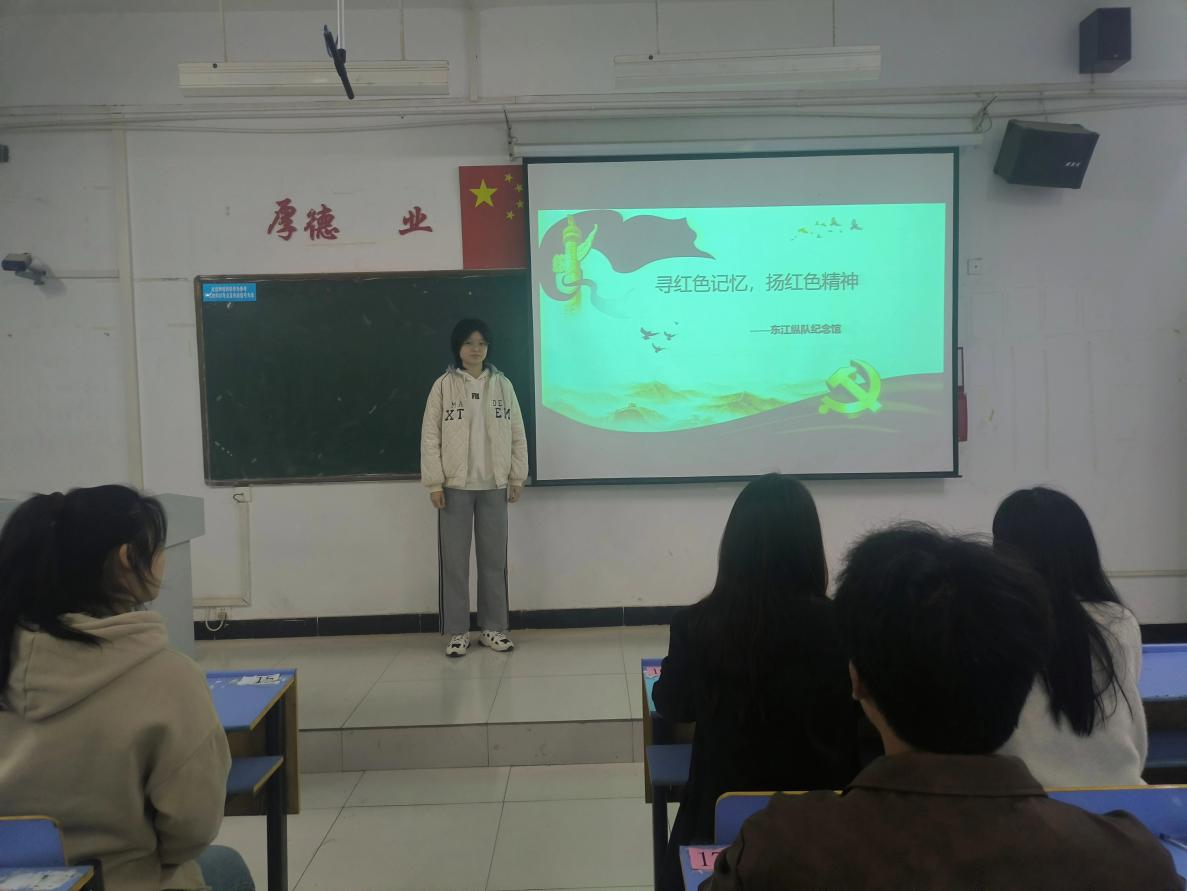 活动中,组织委员崔婷围绕“寻红色记忆,扬红色精神”之东江纵队纪念馆为主题,系统讲述了东江纵队纪念馆的背后的故事与精神内涵,并结合实际生活进行了深刻剖析。会议多次强调,寻红色记忆,是为了更好地传承;扬红色精神,是为了更好地前行。这次主题教育让红色基因深深植根于每位参与者的心中。组织委员号召学生党员深刻领会其精神内涵,将规定要求内化于心、外化于行,不断提升自身的精神世界,提高自身的政治素养,在日常学习生活中时刻做到心中有党、言行守纪。